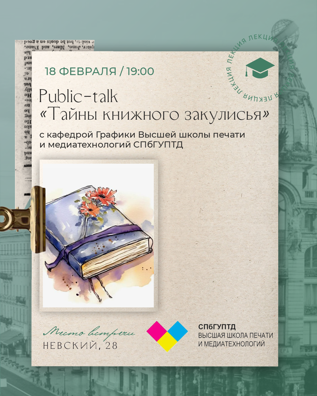 18 февраля 2026 года в Доме книги состоится творческая встреча Public-talk «Тайны книжного закулисья» с кафедрой Графики Высшей школы печати и медиатехнологий СПбГУПТД.